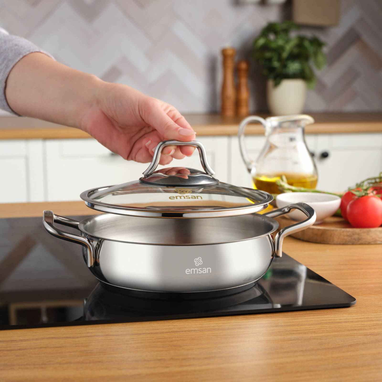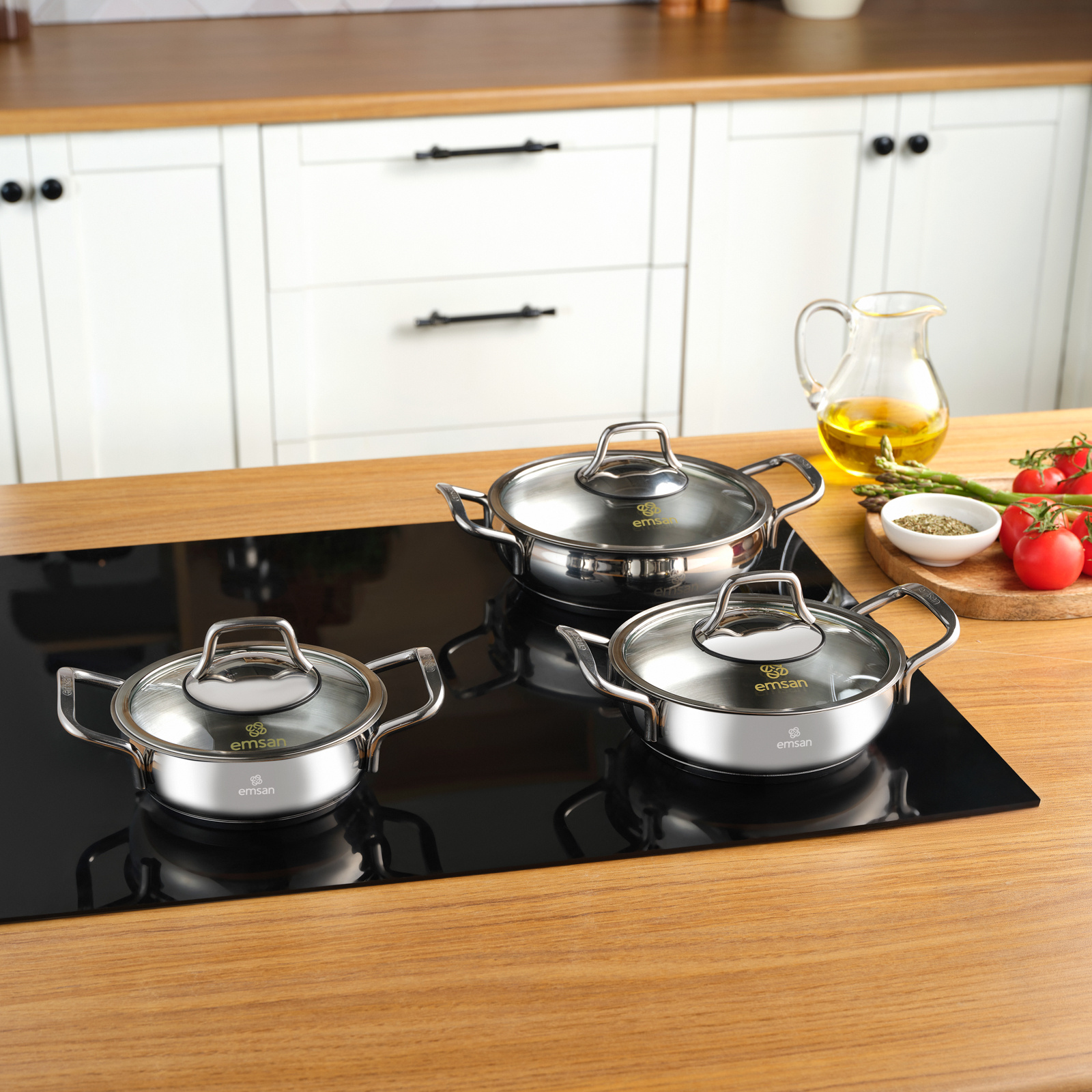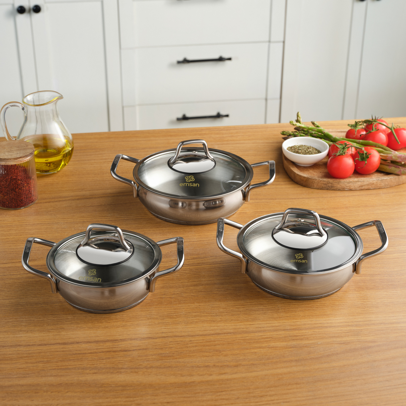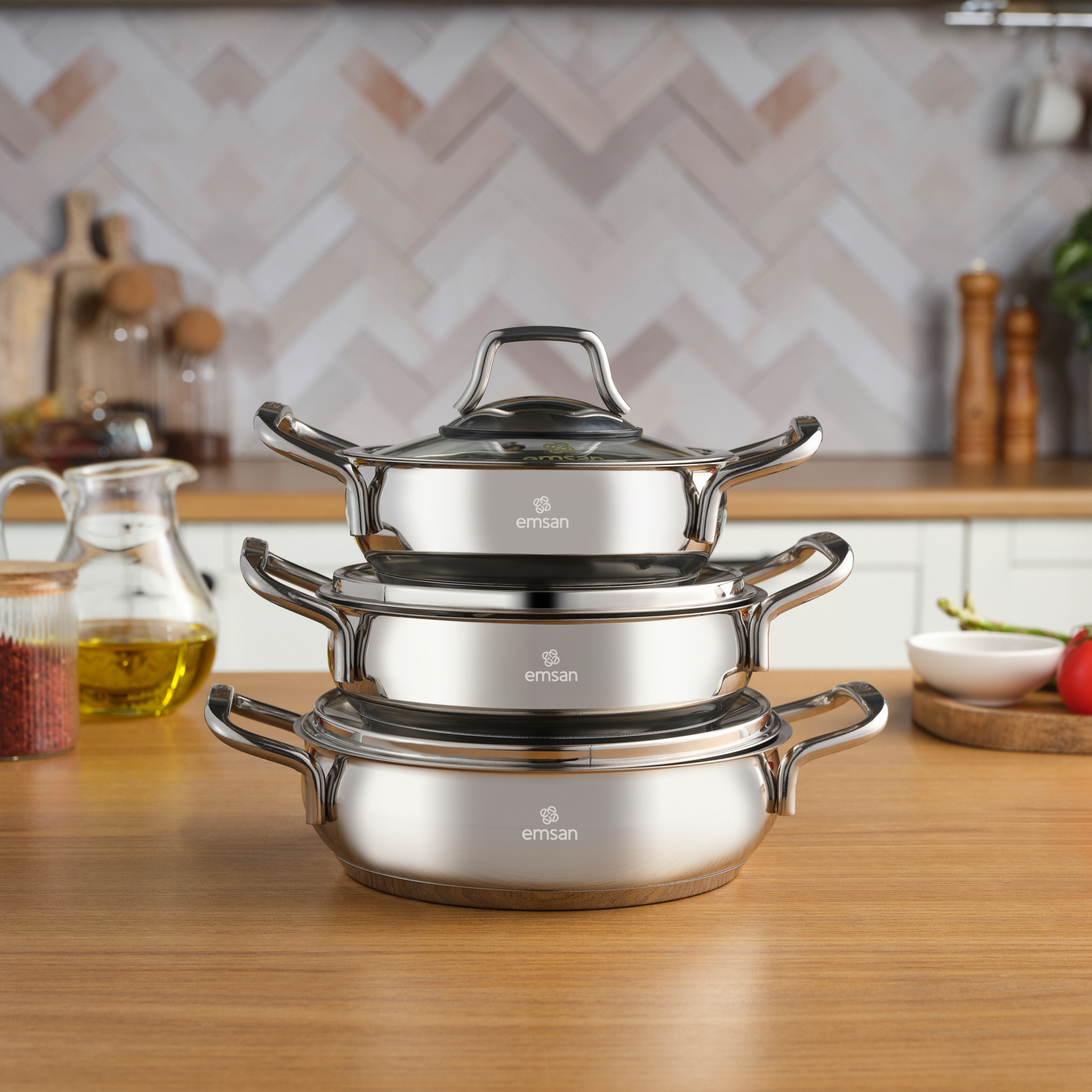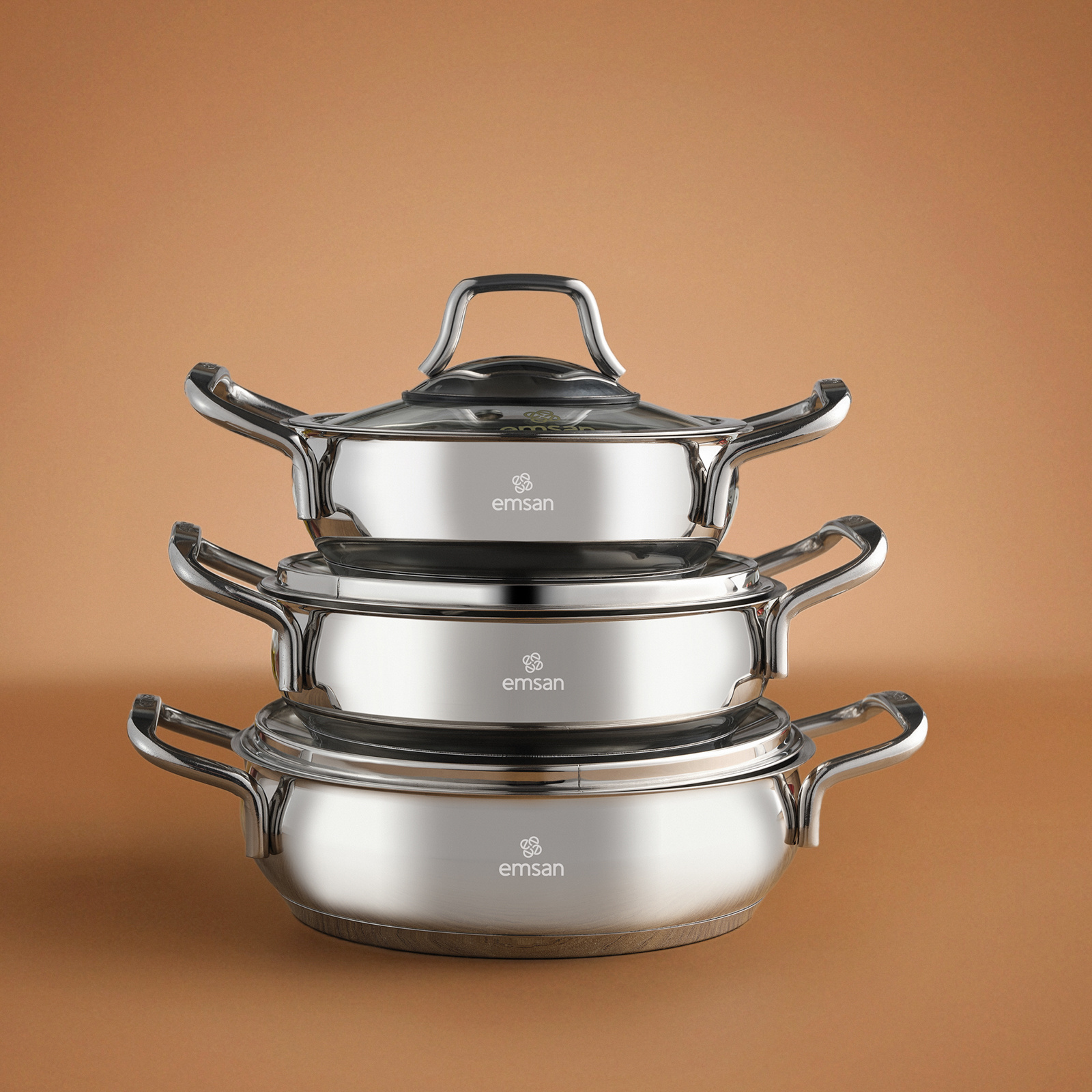 Yiyeceklerin vitamin ve mineral değerlerini kaybetmeden pişmelerini sağlayan Emsan Cemre 6 Parça Paslanmaz Çelik Sahan Seti.