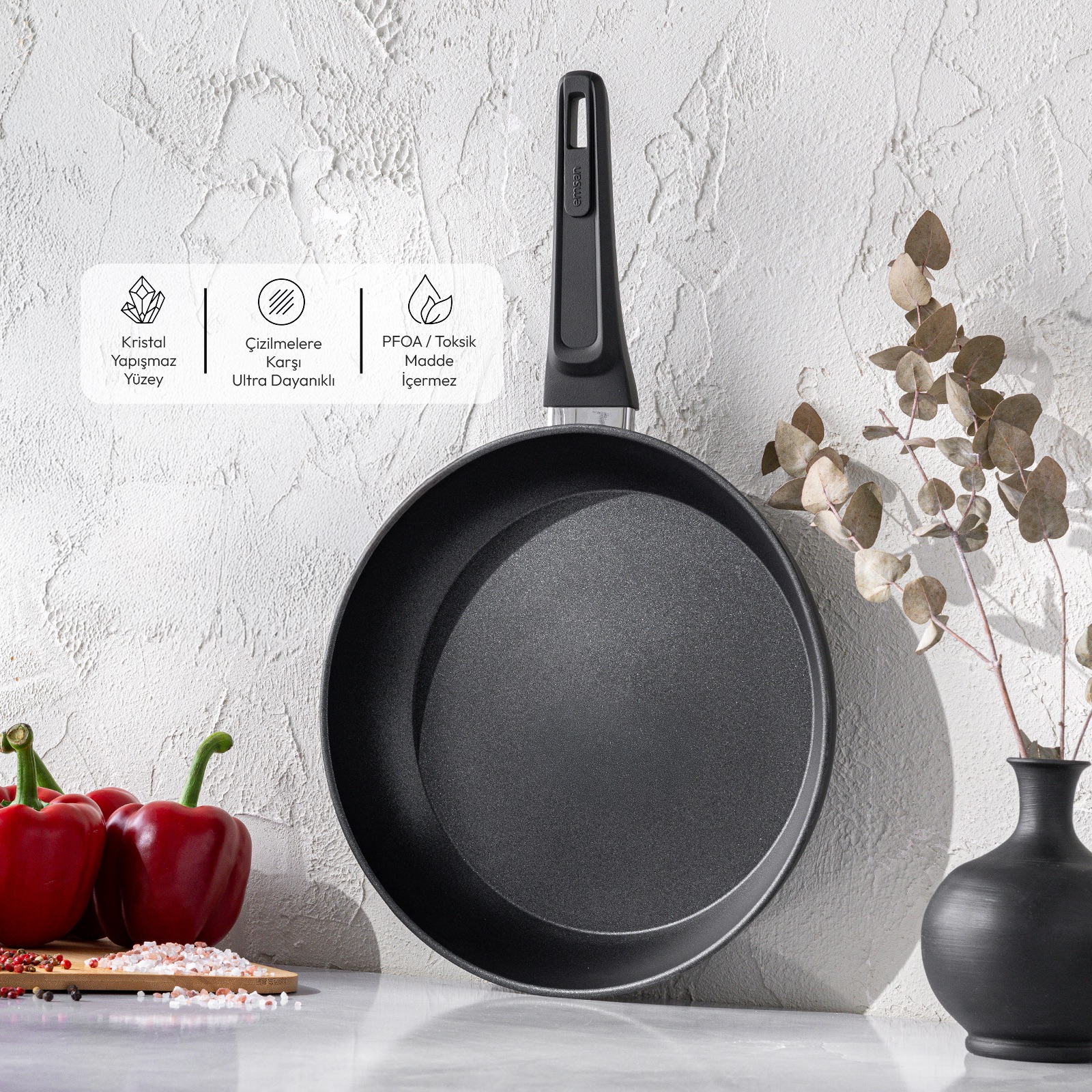 Emsan Diamente, gücünü ve sağlamlığını doğanın en dayanıklı harikası gerçek elmas kristallerinden alır. Ultra dayanıklılık ve çizilmezlik özelliği sayesinde metal mutfak gereçleri ile de güvenle kullanılabilir. Üstün yanmaz yapışmaz yüzeyi ile et, balık, yumurta ve sebzeleri yağ kullanmadan sağlıklı bir şekilde pişirmeye olanak sunar. Isıyı her tarafa eşit olarak dağıtması sayesinde yemeklerin daha lezzetli pişmesini sağlar