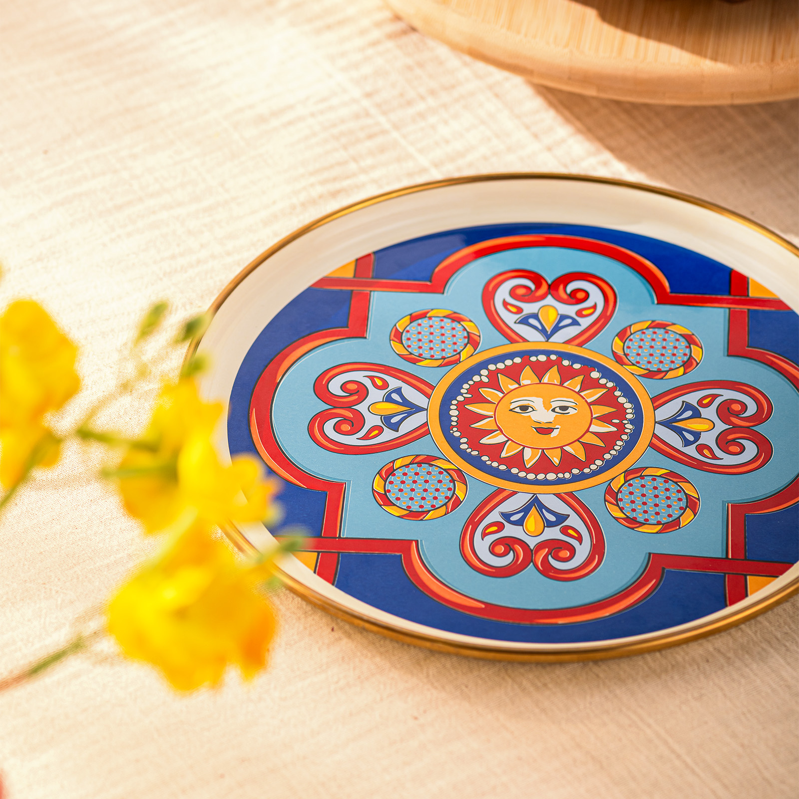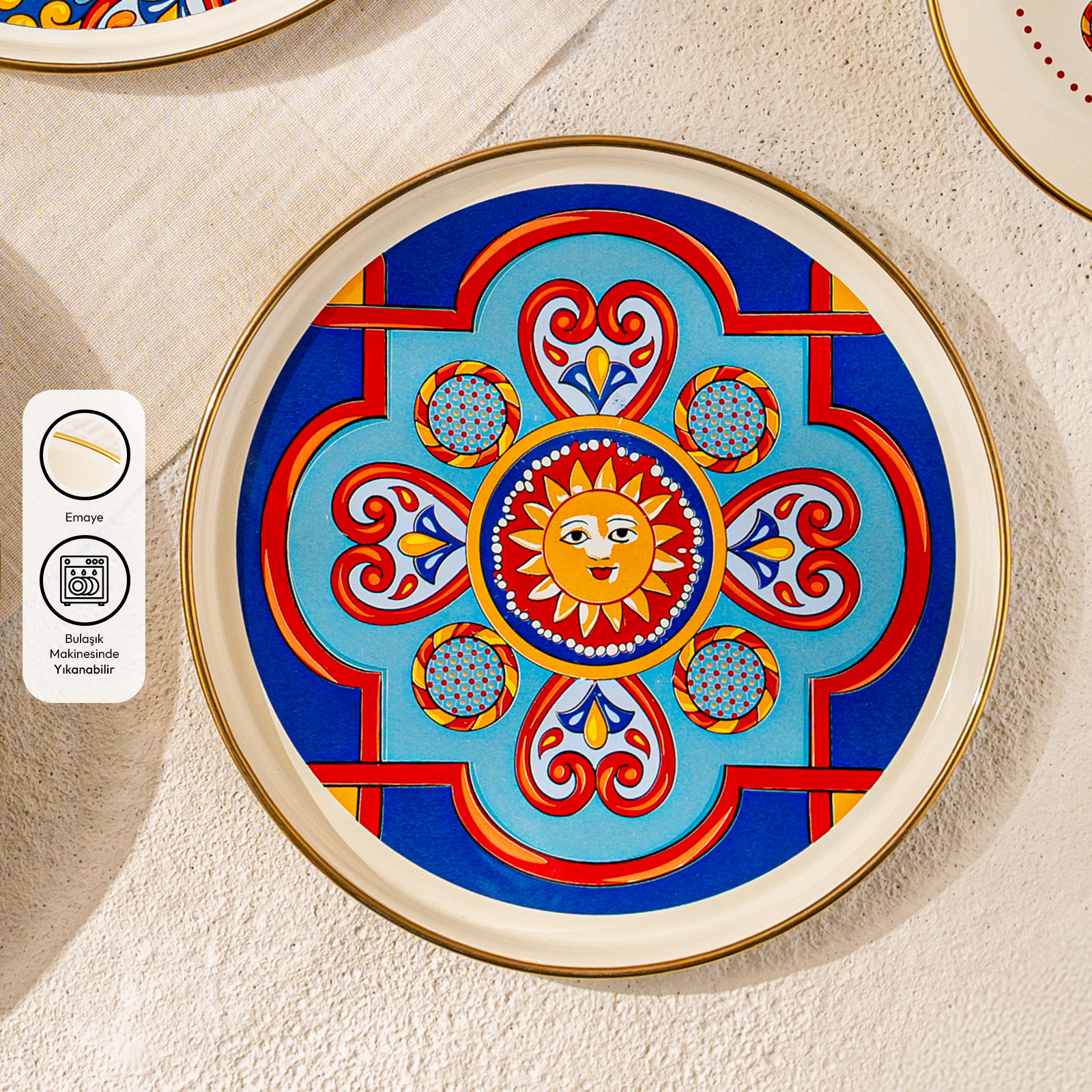 Yazın en parlak anlarından ilham alan Solemar, sofralara sıcak, canlı ve zamansız bir dokunuş getirir. Güneşin altın sarısı ışıltısını yansıtan motifleri; bereketi ve paylaşımı simgelerken, dingin mavi tonlar denizin huzurunu sofranıza taşır. Kırmızı detaylar ise yazın enerjisini ve neşesini her an hissettirir.