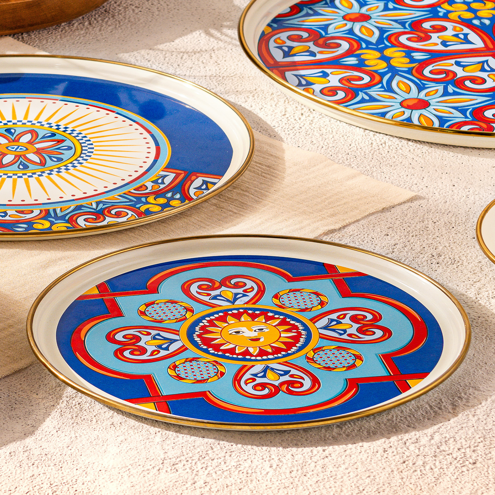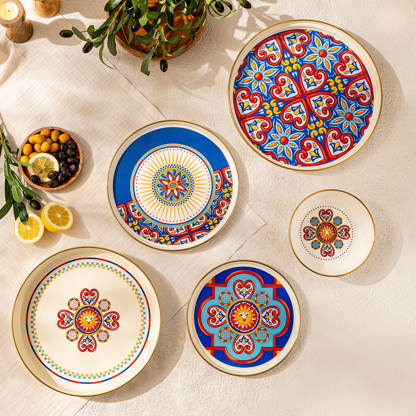 • Servis ve Sunum Ürünleri: Çukur tabak, pasta tabağı, servis tabağı, sunumluk ve tepsi; sofralarınıza yazın enerjisini yansıtan desenleriyle şıklık katarken, günlük kullanımdan özel davetlere kadar geniş bir kullanım sunar.