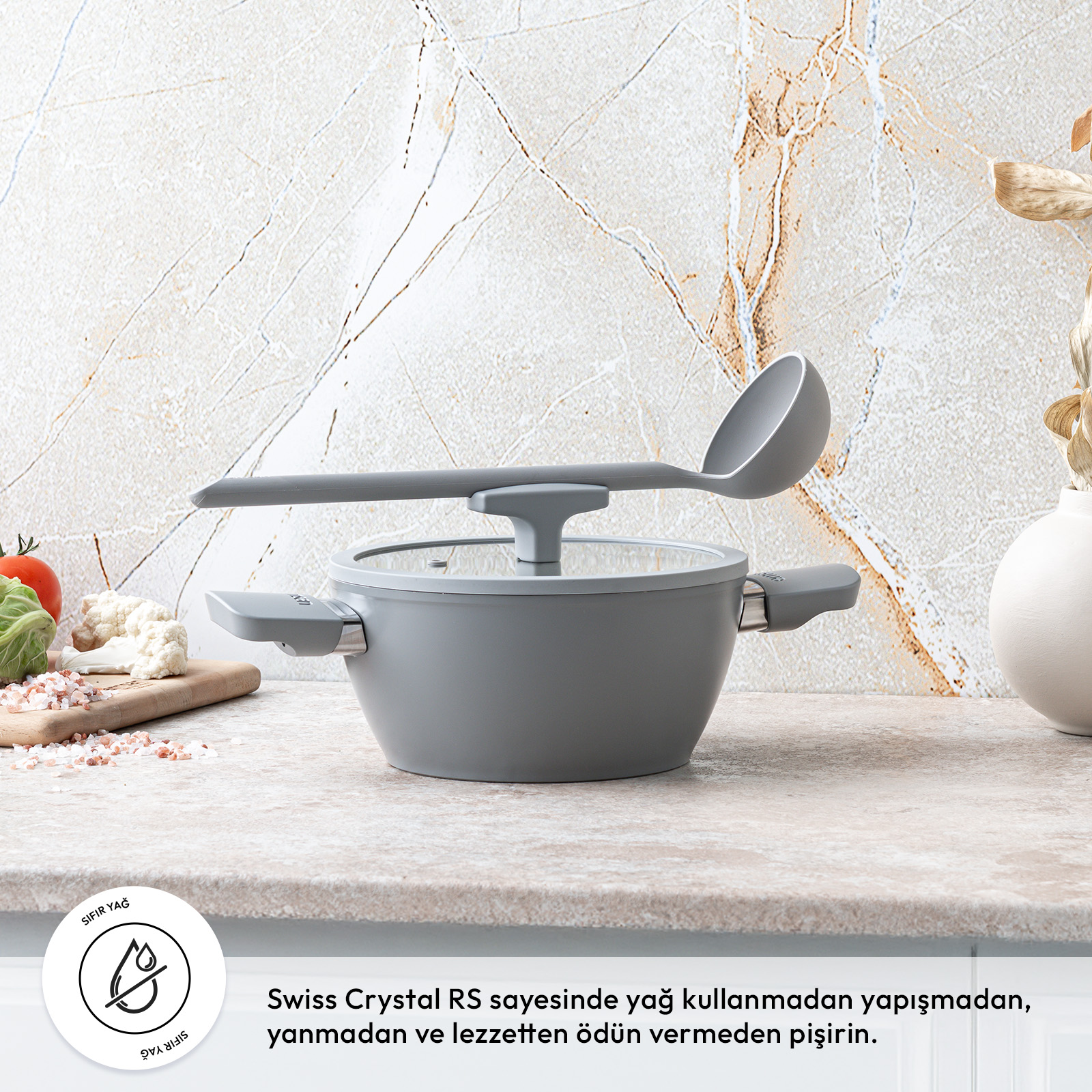 İsviçre kristal teknolojisiyle geliştirilen Swiss Crystal RS Serisi, üstün yapışmaz yüzeyi sayesinde sıfır yağ ile lezzetli yemekler pişirmenizi sağlar. Isıyı eşit dağıtan özel yapısı, yiyeceklerin ideal kıvamında pişmesine yardımcı olur. Kolay temizlenen, toksik madde içermeyen güvenli yapısıyla mutfağınızda pratik ve sağlıklı bir kullanım sunar.